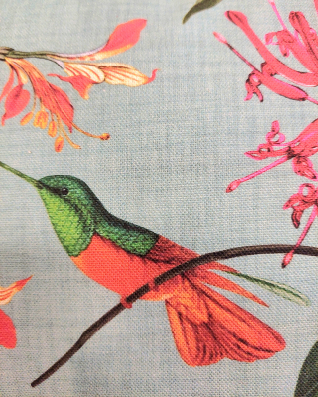 Leuk kussen gemaakt van een canvasstof met een print van bloemen en vogels in vrolijke kleuren op een licht turquoise ondergrond.