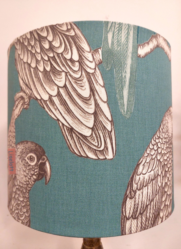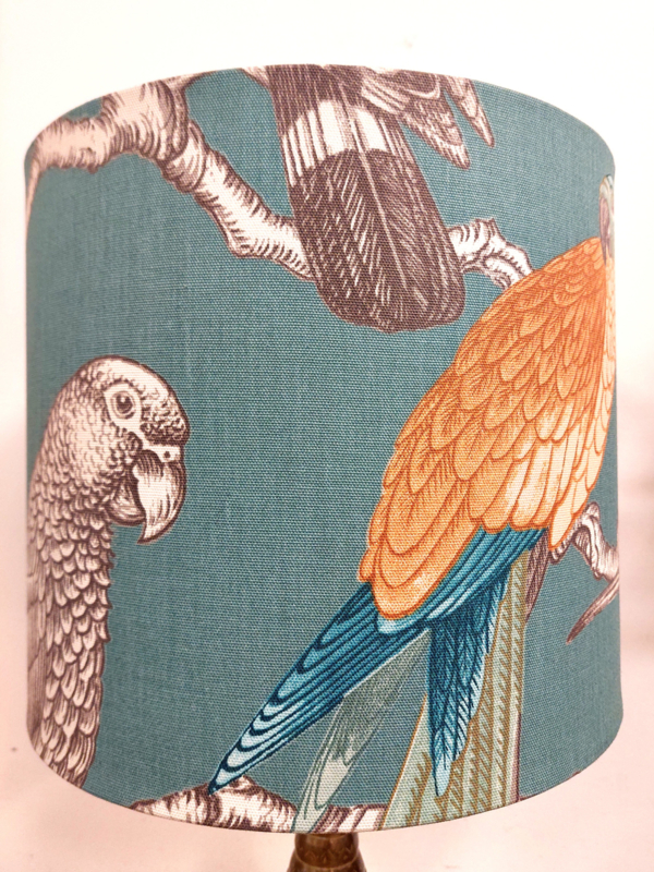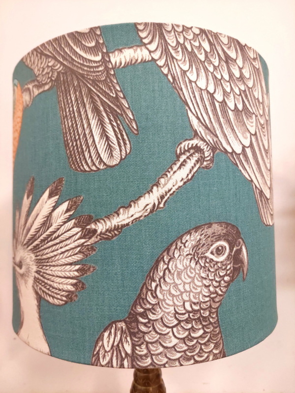 Mooie lampenkap gestoffeerd met een canvasstof met een print van vogels op een petrol kleurige ondergrond.
