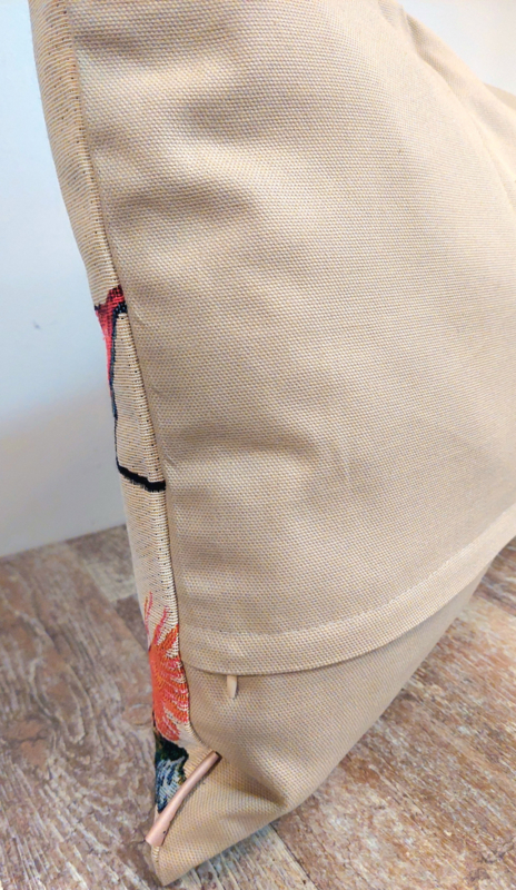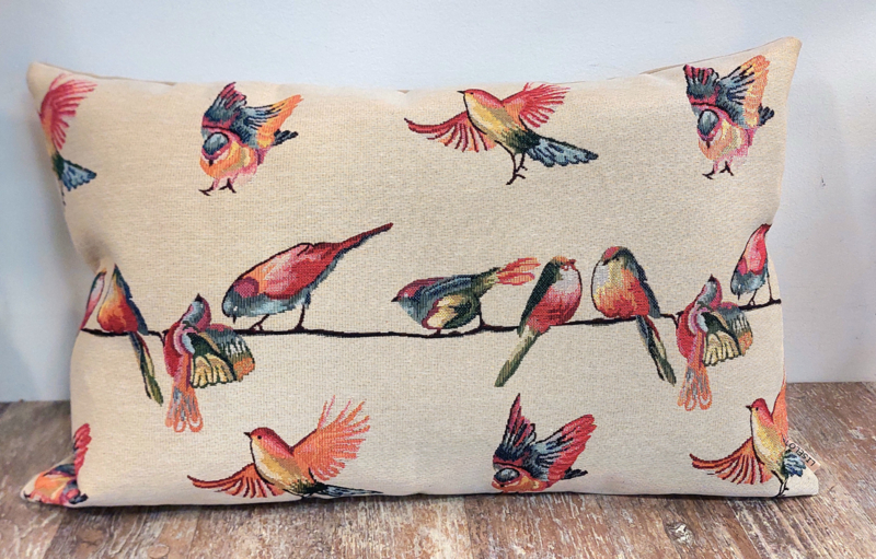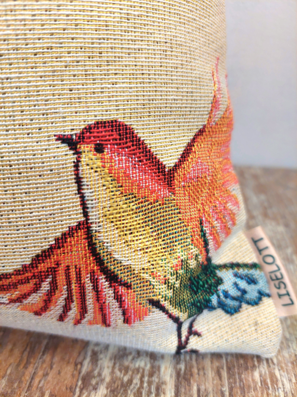 Vrolijk kussen gemaakt van een gobelin stof met zandkleurige canvas achterkant met onzichtbare ritssluiting.