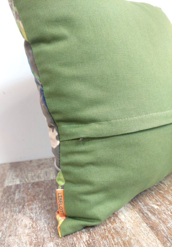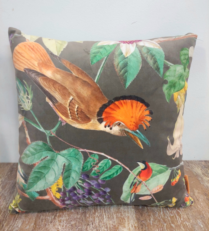 Leuk kussen gemaakt van een velvetstof met een print van vogels en bloemen op een muisgrijze ondergrond.