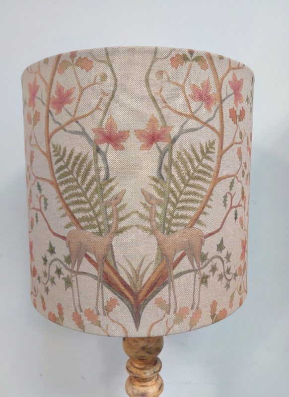 Lampenkap canvas chateau hertenMooie lampenkap gestoffeerd met een canvasstof met een print van dieren ( herten, eekhoorns) En bloementakken op een zandkleurige ondergrond.
